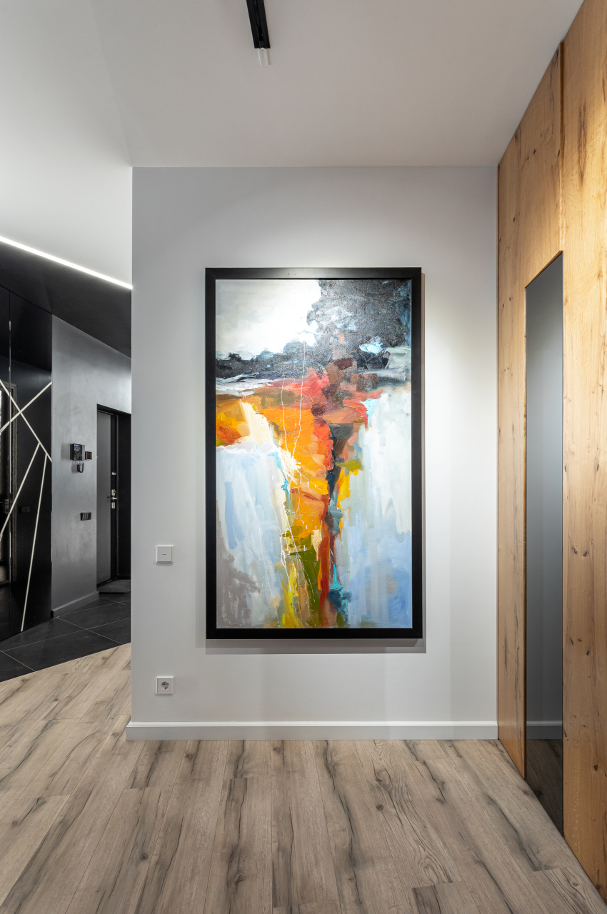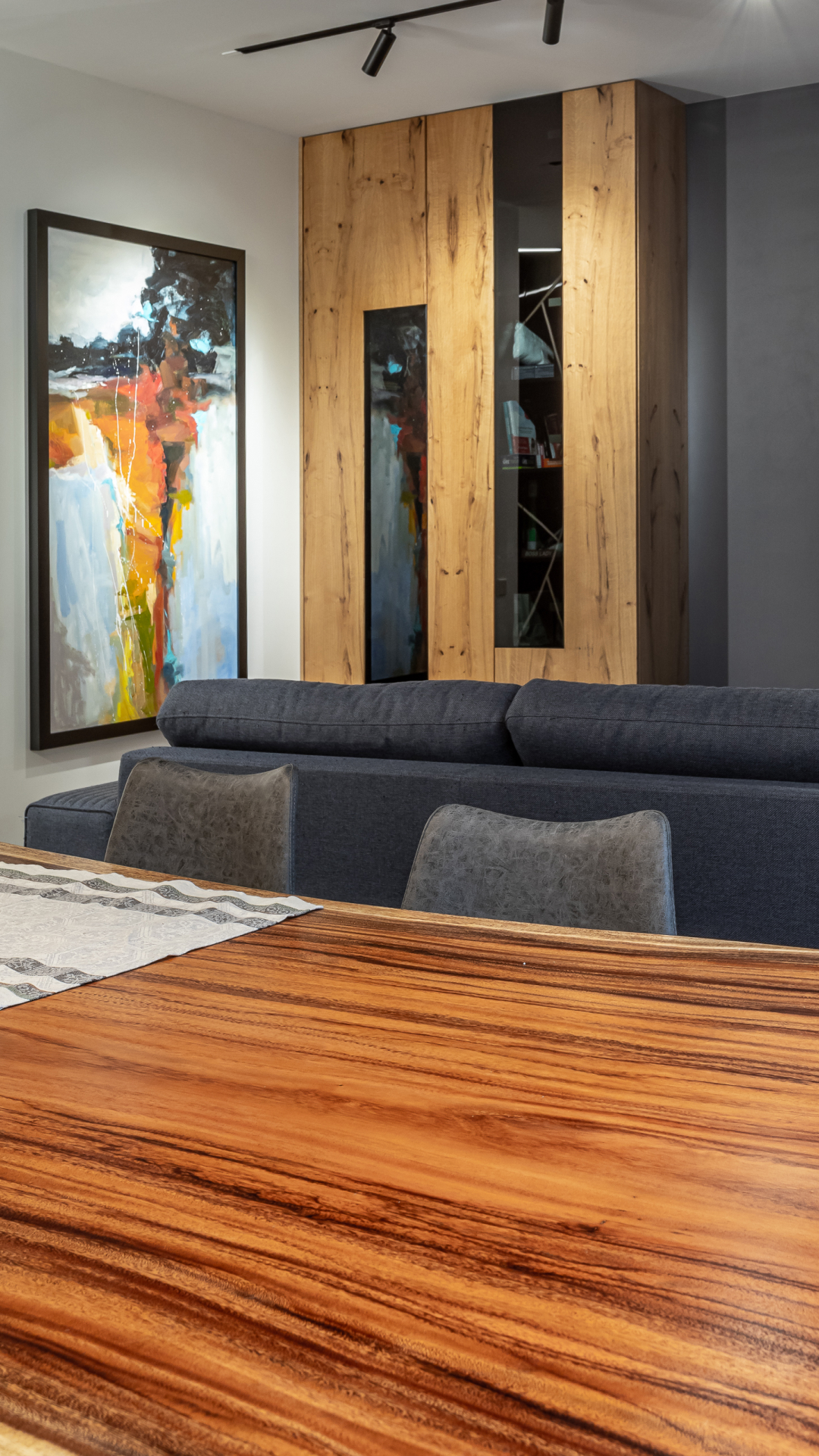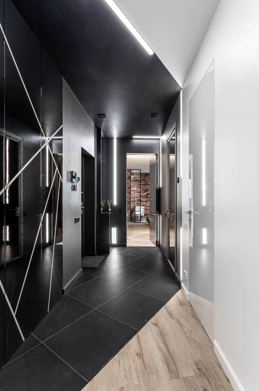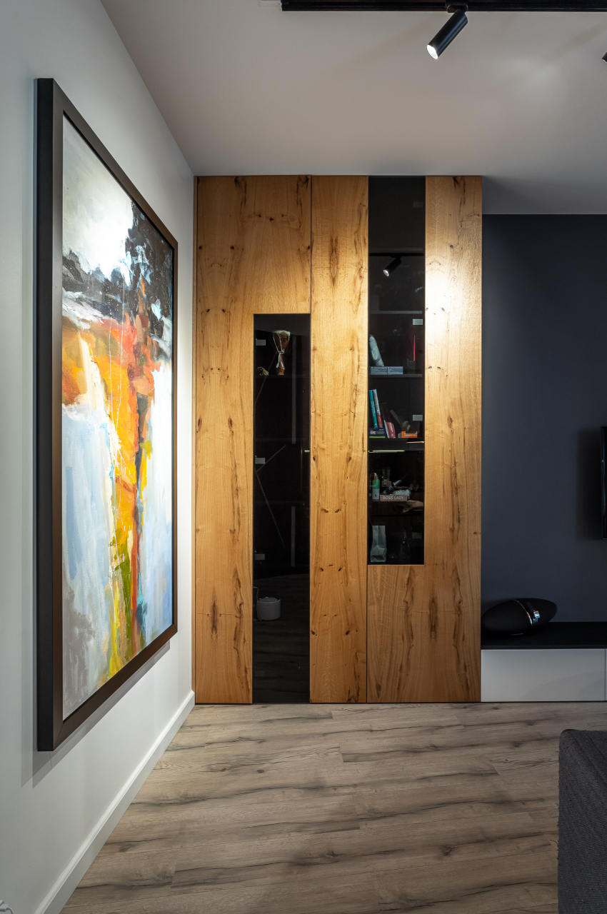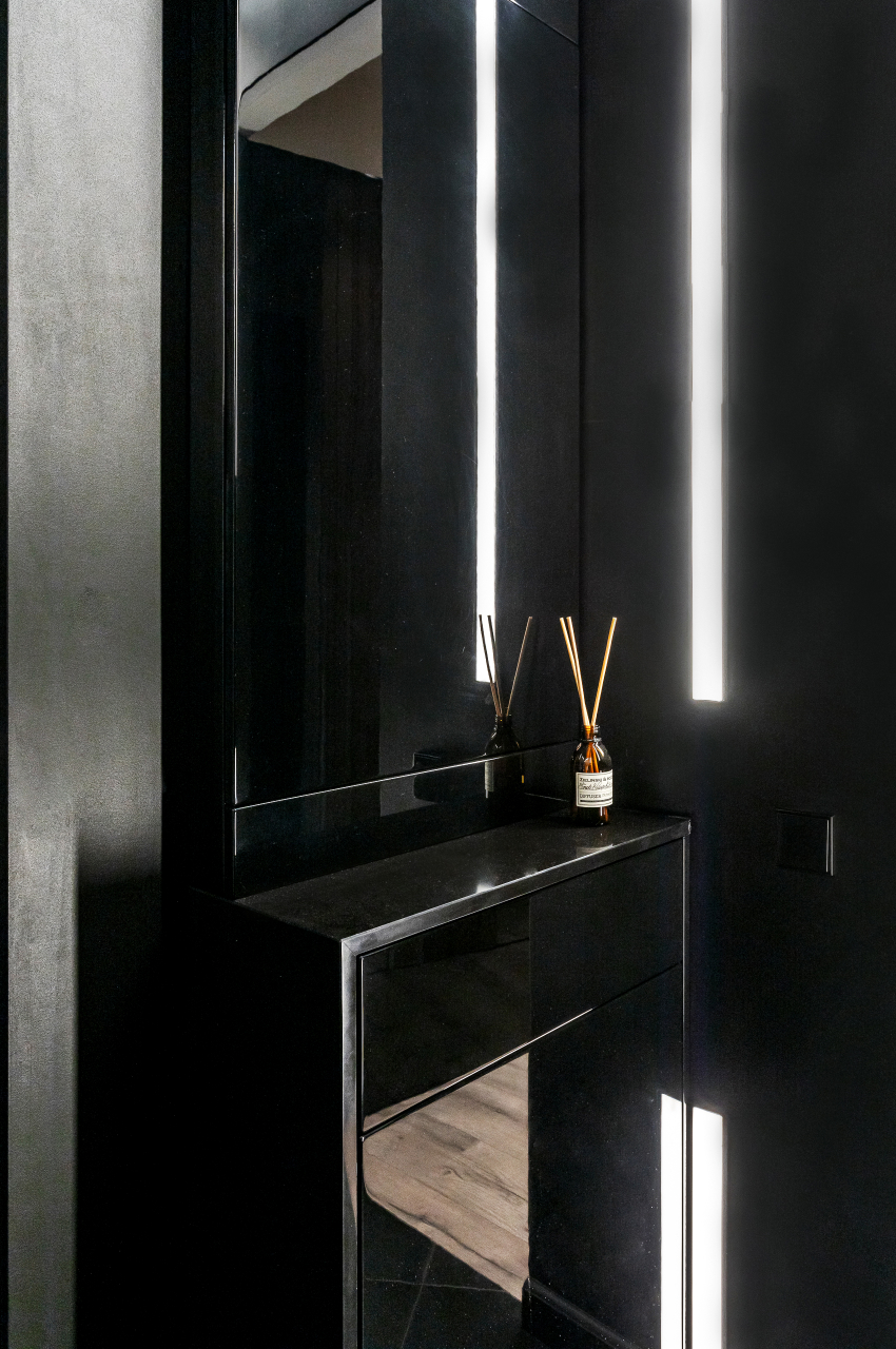 Если приглядеться к фотографиям проекта, на одной из них можно увидеть черный коридор. Мы задумали его в виде портала со световыми лучами, который соединяет два пространства — гостиную и спальню. Про эко мы тоже не забыли — реализовали в виде «растущих» деревьев на стенах, дверцах шкафов. И сделали самое большое дерево — кухонный стол для бесконечных ночных разговоров о важном и вечном.