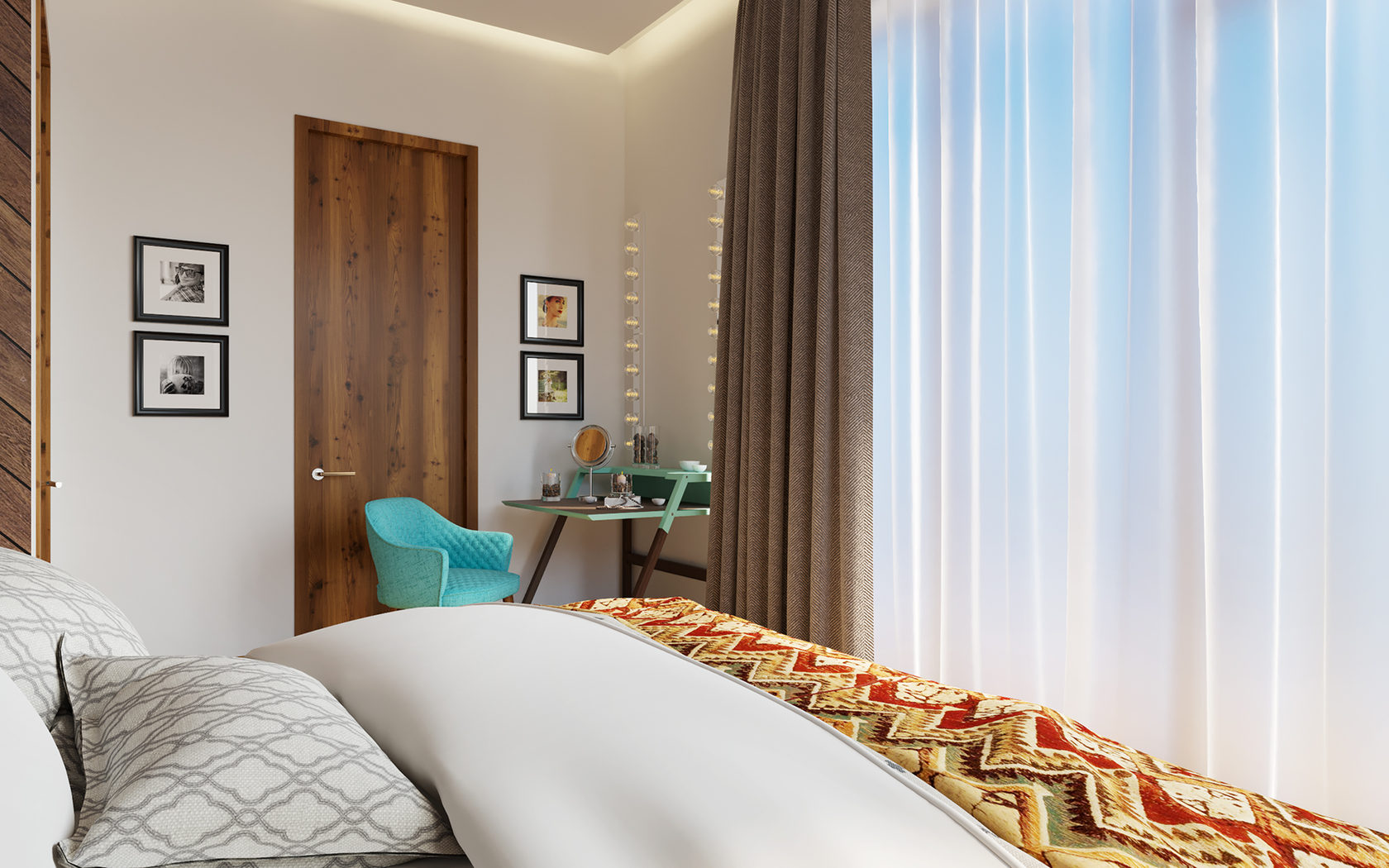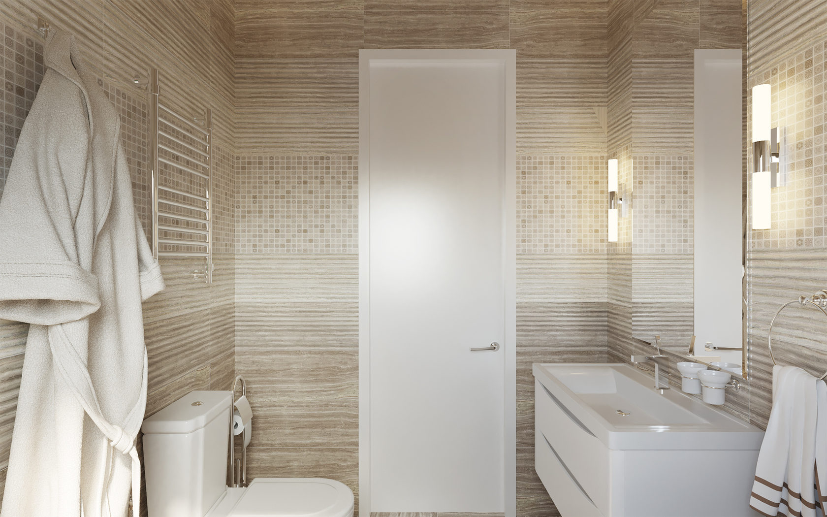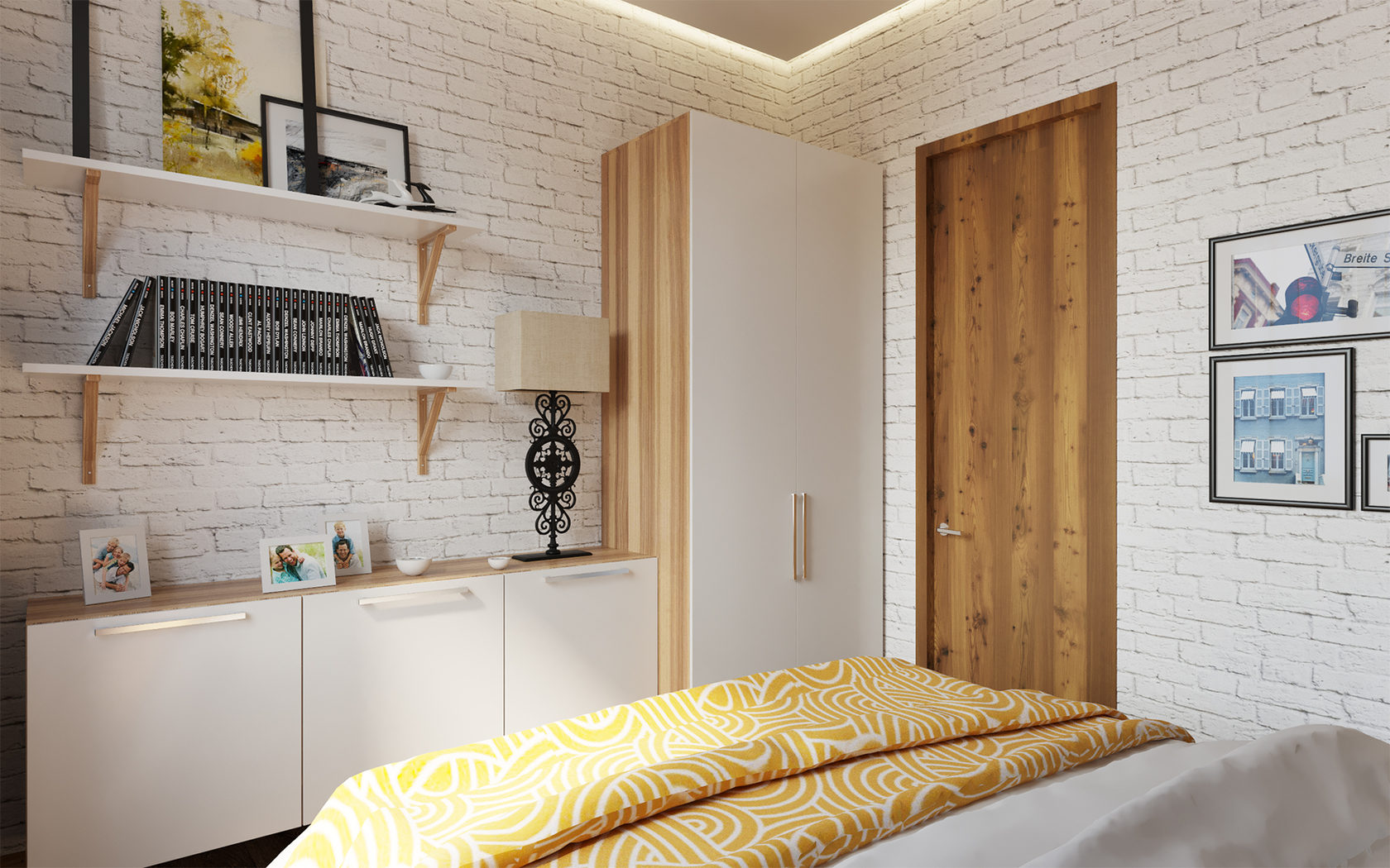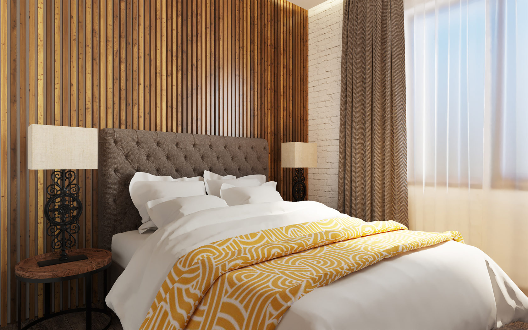 Идея создания воздушного интерьера 2-х комнатной квартиры побудила использовать экологически-чистые материалы в виде дерева, камня и декоративной штукатурки.