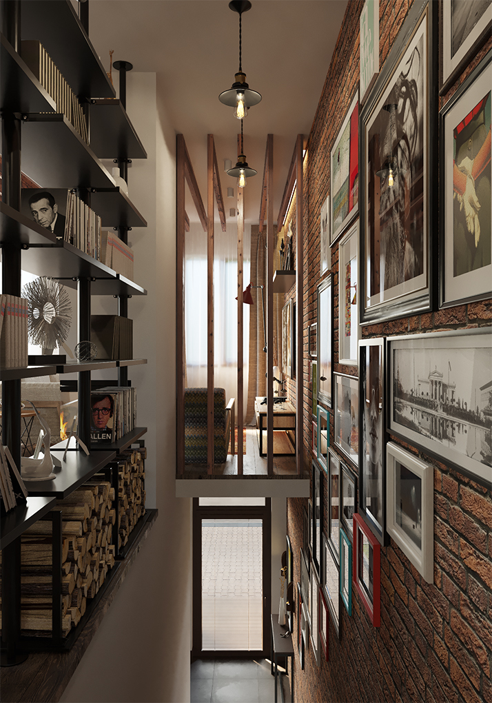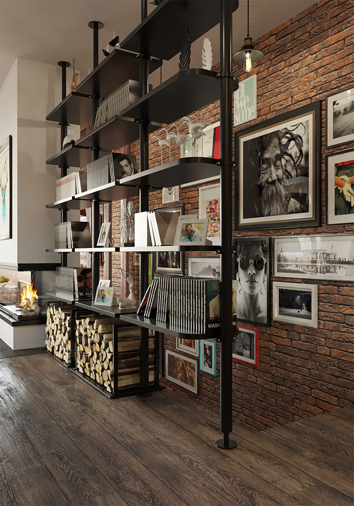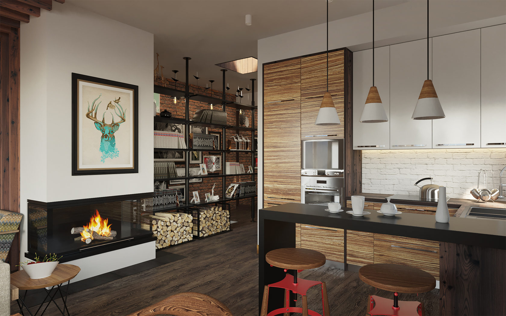 Разные текстуры стен, ритмические конструкции стеллажей и полок, четкая геометрия кухонной мебели и балок собрали гармоничное пространство в едином решении. Аксессуары в виде картин и светильников, теплые цвета деревянных вставок добавили уюта и оживили интерьер.