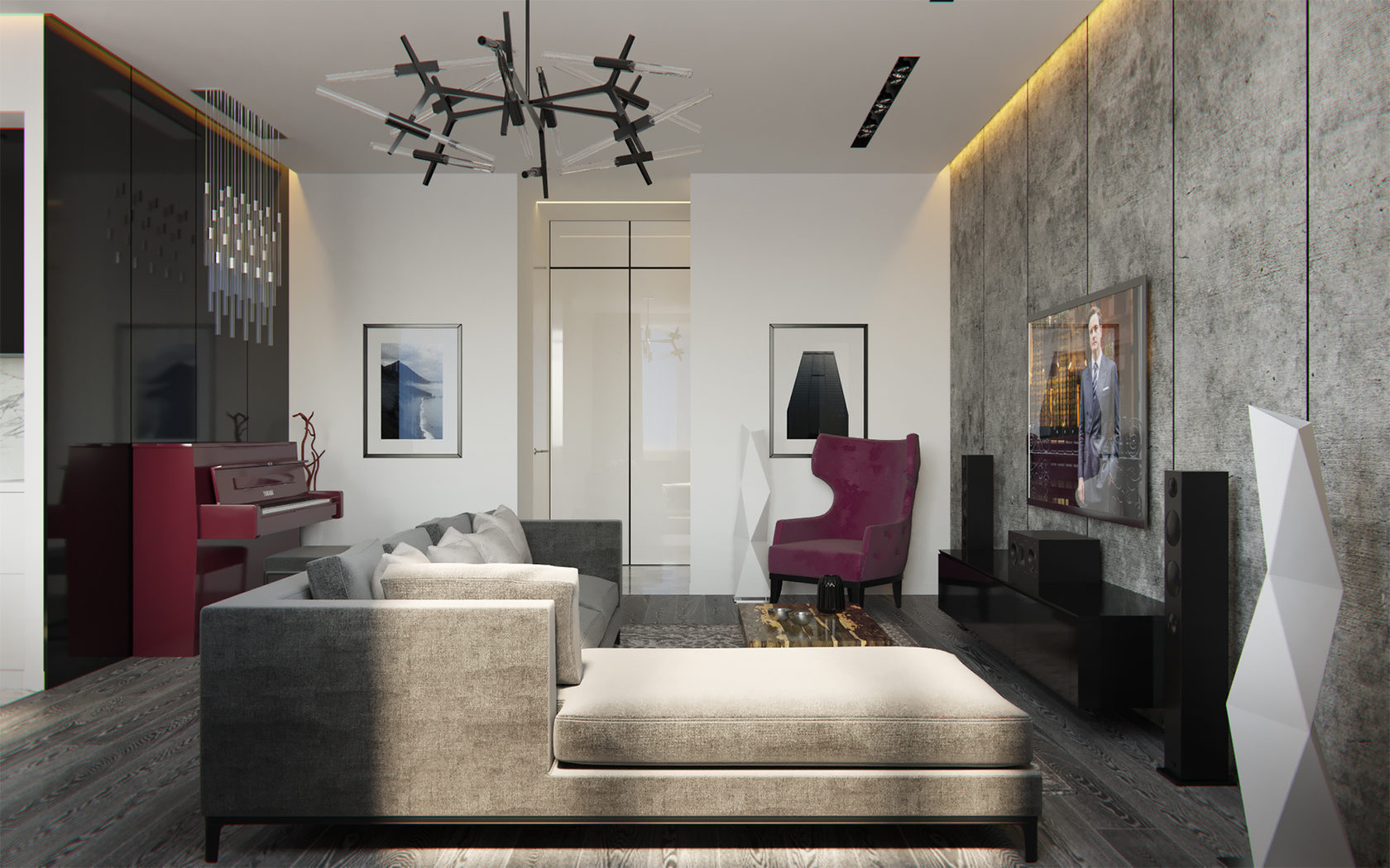Из необычного — учитывая вкусы заказчика, заложили в визуальный образ интерьера идею музыкальных ритмов. Последовательность звуков и пауз, чередование черного и белого, гладкого и шереховатого — музыка пронизывает все пространство, а аудиосистема есть во всех помещениях. Интерьер подойдет для тех, кто живет один. Для людей практичных, сдержанных и логичных, ценящих дорогие вещи и комфорт.