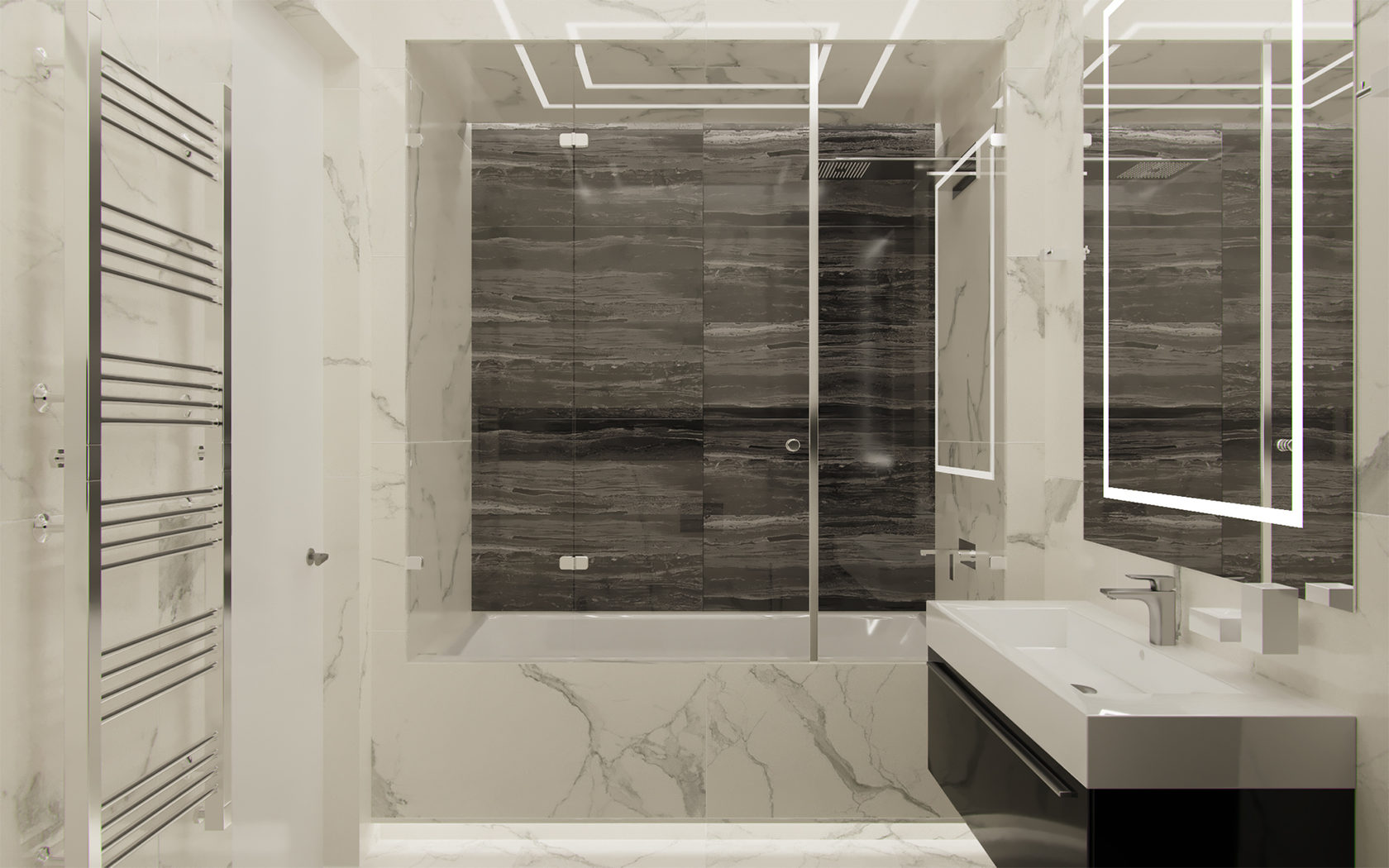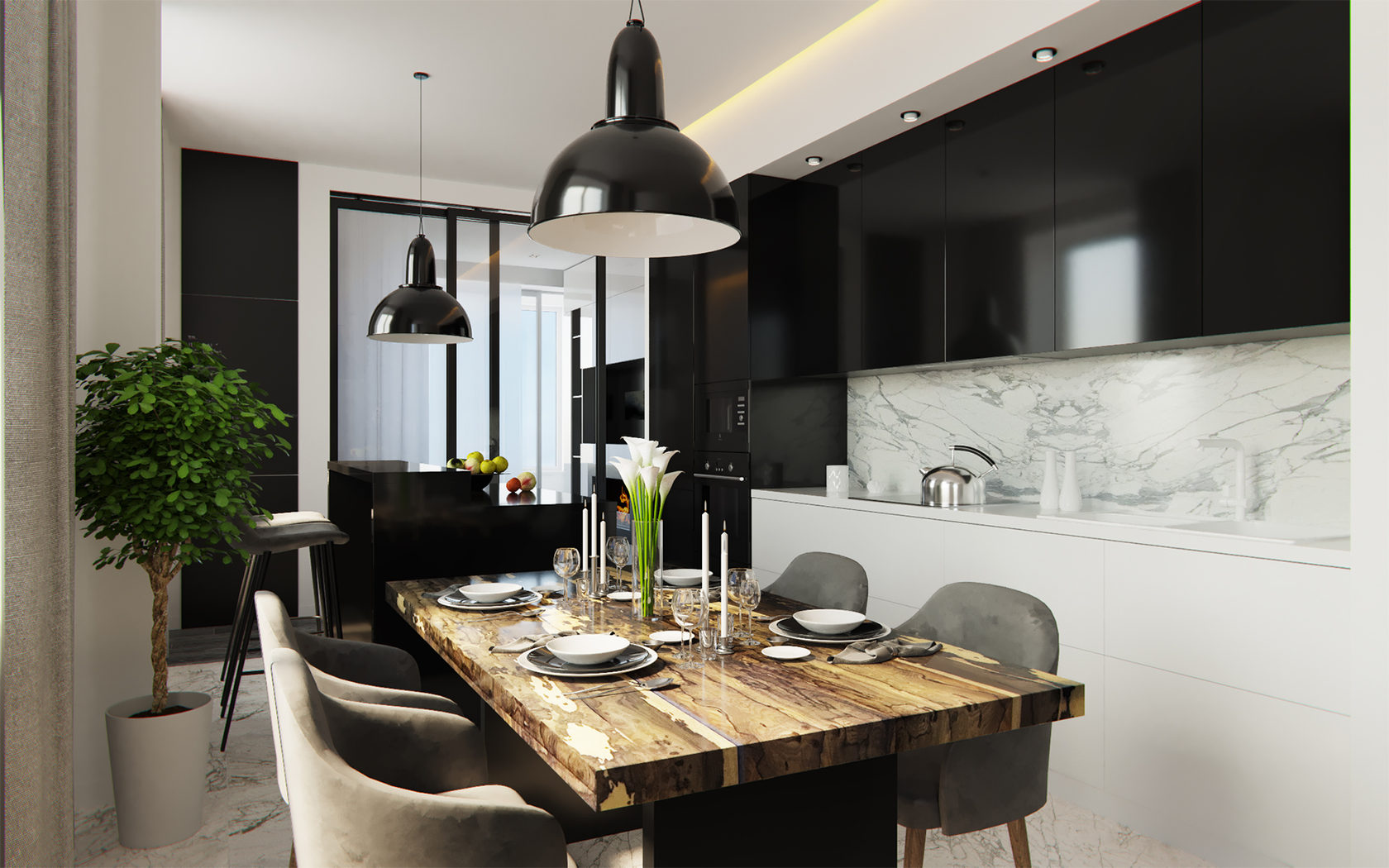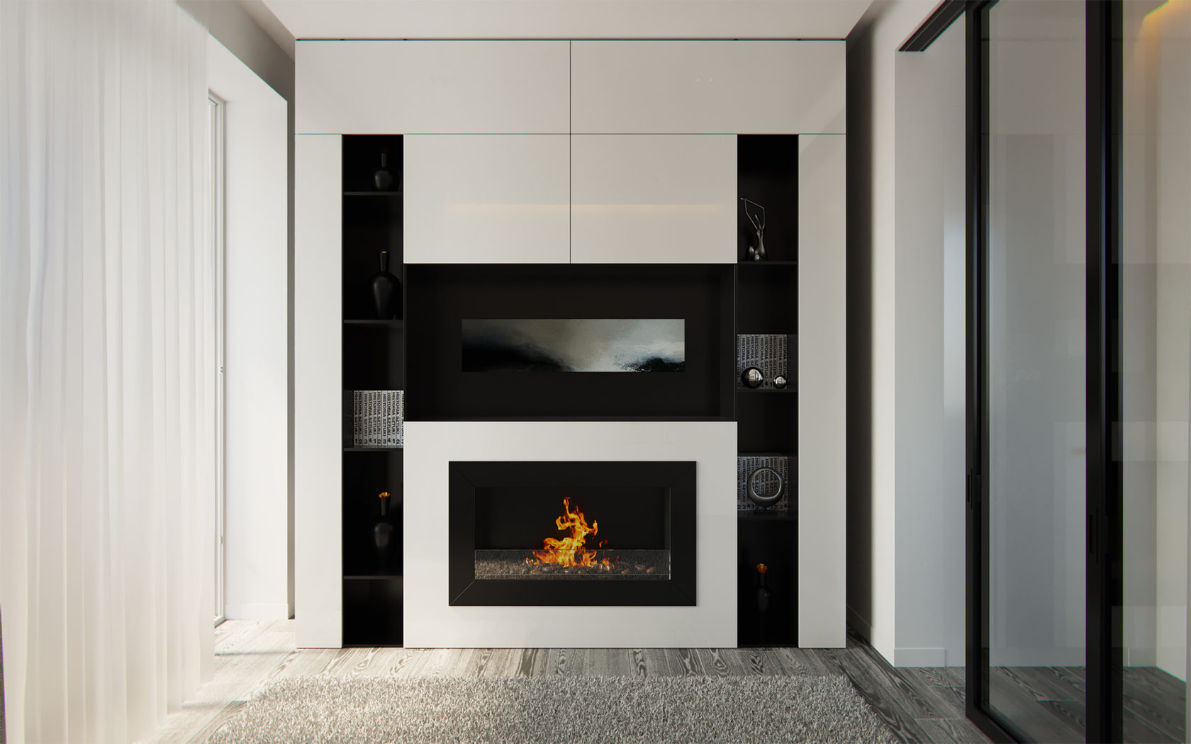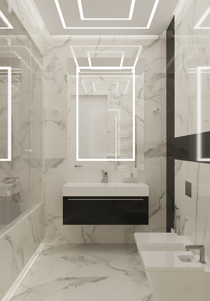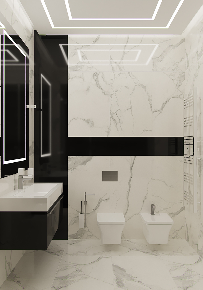 Жилое пространство использовали на максимум. Теперь оно напоминает комфортную и функциональную машину, которая слушает человека. Интегрировали систему «умный дом», цветную подсветку. «Умный дом» позволяет выполнять часть бытовых задач без участия человека. Подсветка дает возможность менять цветовую гамму в интерьере по настроению. Интерьер выполнен в монохромной гамме на контрасте чёрного и белого. Так подчеркнули геометрию пространства, сделали формы эстетичными и завершенными.